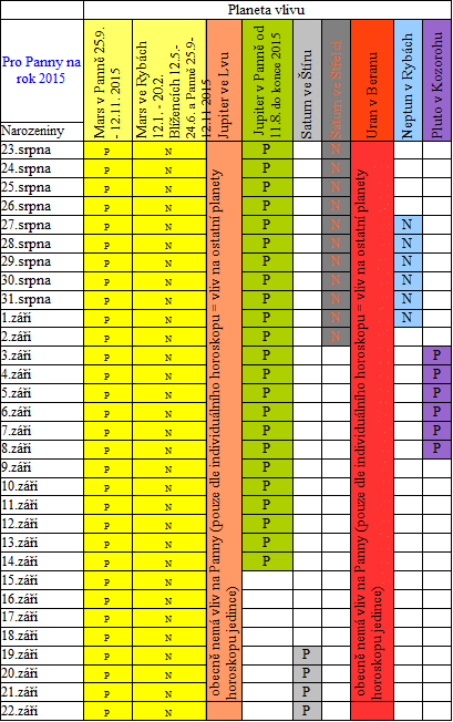 P=příznivě , P =příznivě, ale slabší vliv, N=nepříznivě , N =nepříznivě, ale slabší vliv. Vyznačené oblasti udávají, kterých Panen, se to týká. Pokud mezi ně patříte, musíte též nahlédnout do pohybů planet (viz. níže) a odhadnout, kdy asi daný jev pro Vás nastane. (Nebo si to u nějakého astrologa nechat dopočítat, možno se naučit vypočítat si sám/sama s pomocí nějakého programu či knih.)